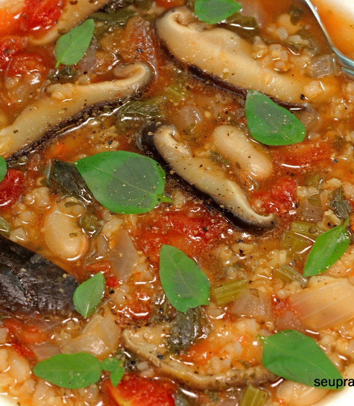 Nestes dias em que o clima esfriou, preparamos no jantar esta sopa de tomates, arroz integral e cogumelos. Muito leve, fácil de fazer e com ingredientes que todos temos em casa. Ficou nota 10. Experimente!