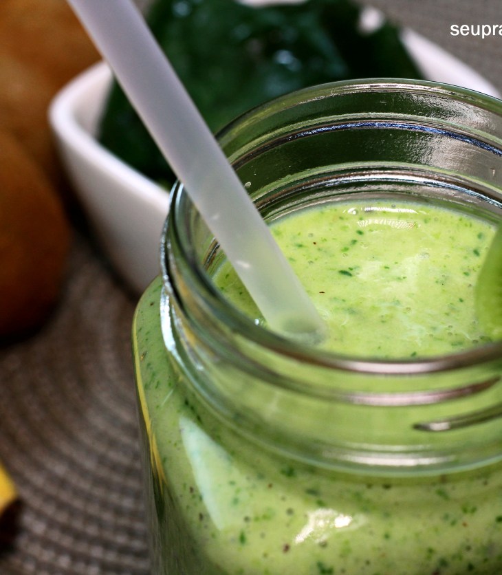Um excelente café da manhã, com frutas doces como banana e kiwi que aportam uma quantidade importante de energia, vitaminas e minerais, e o espinafre com seus nutrientes o complementa. O sabor vai te surpreender!